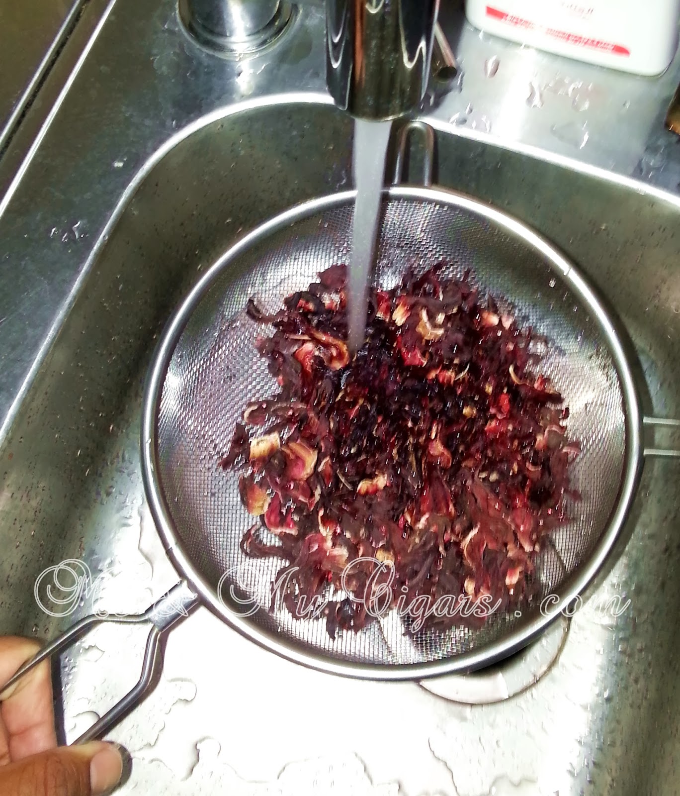 Rinse off the dried Hibiscus under cold running water for a few seconds to get rid of any dirt then dump it into the boiling sugar/water mixture and lower the heat.